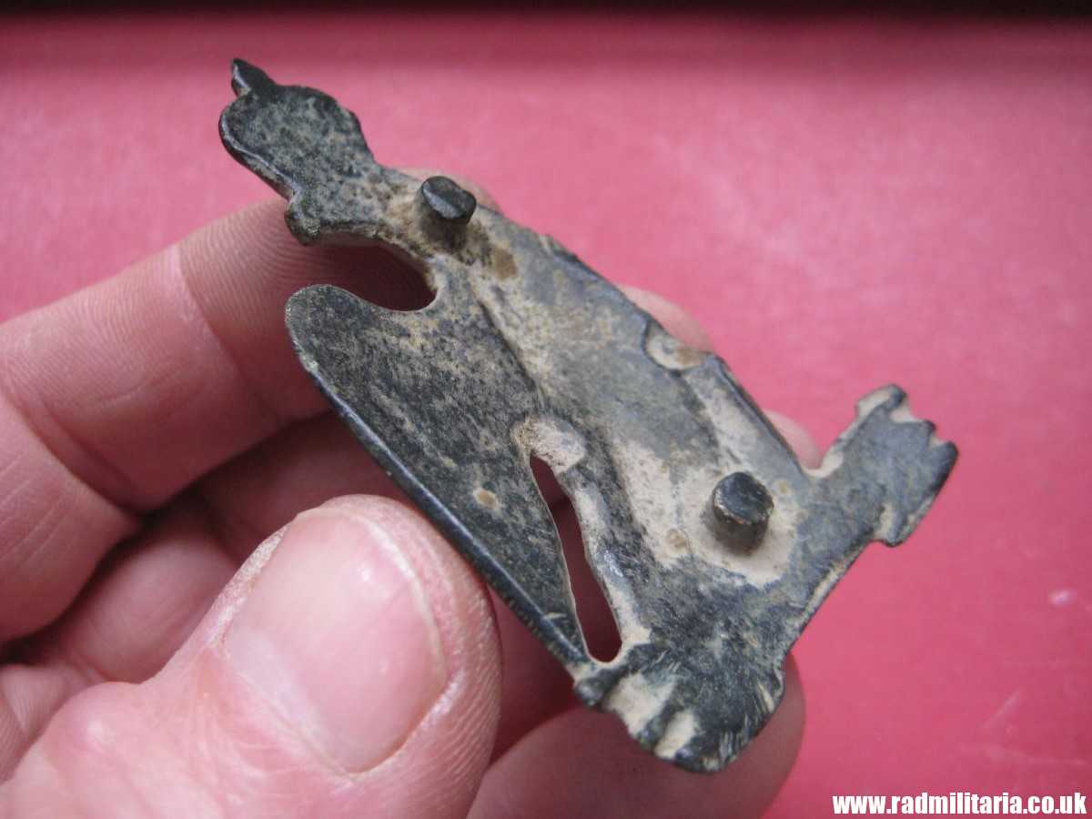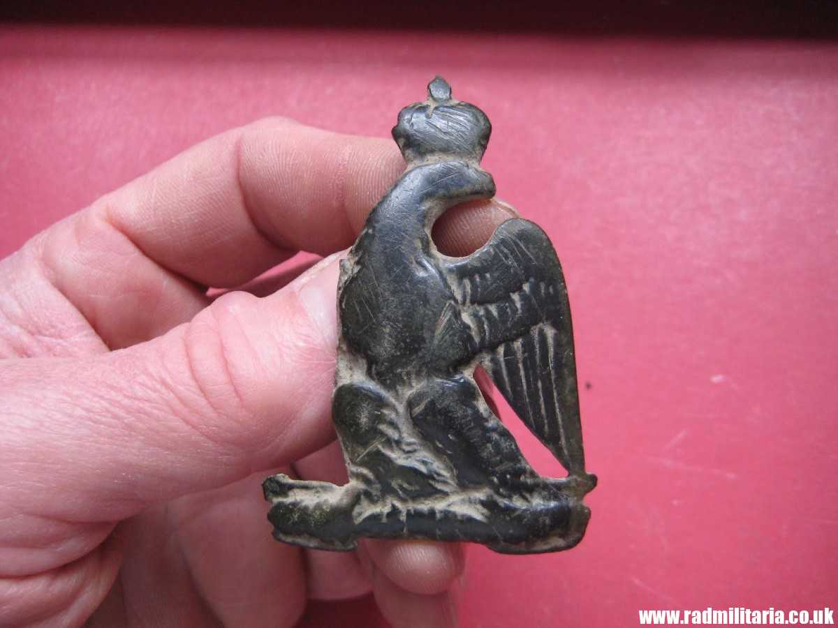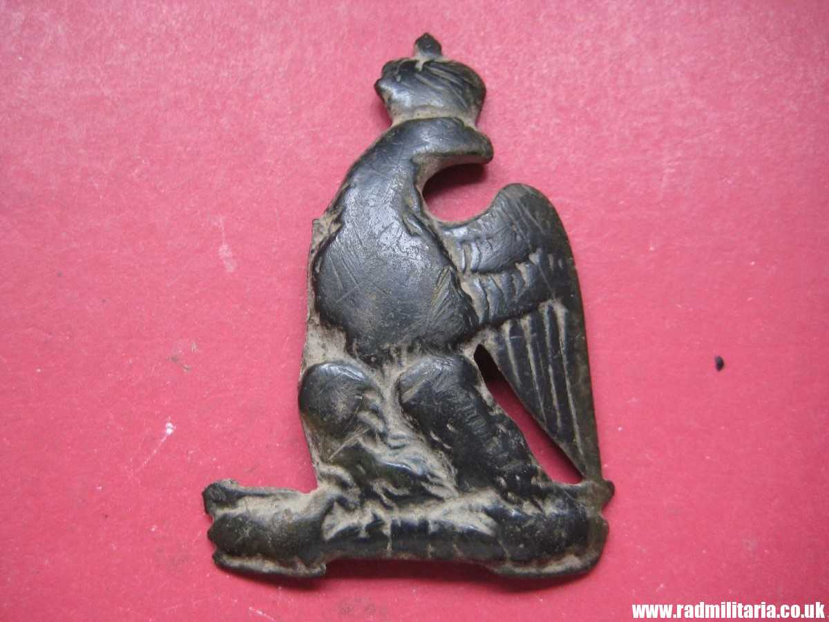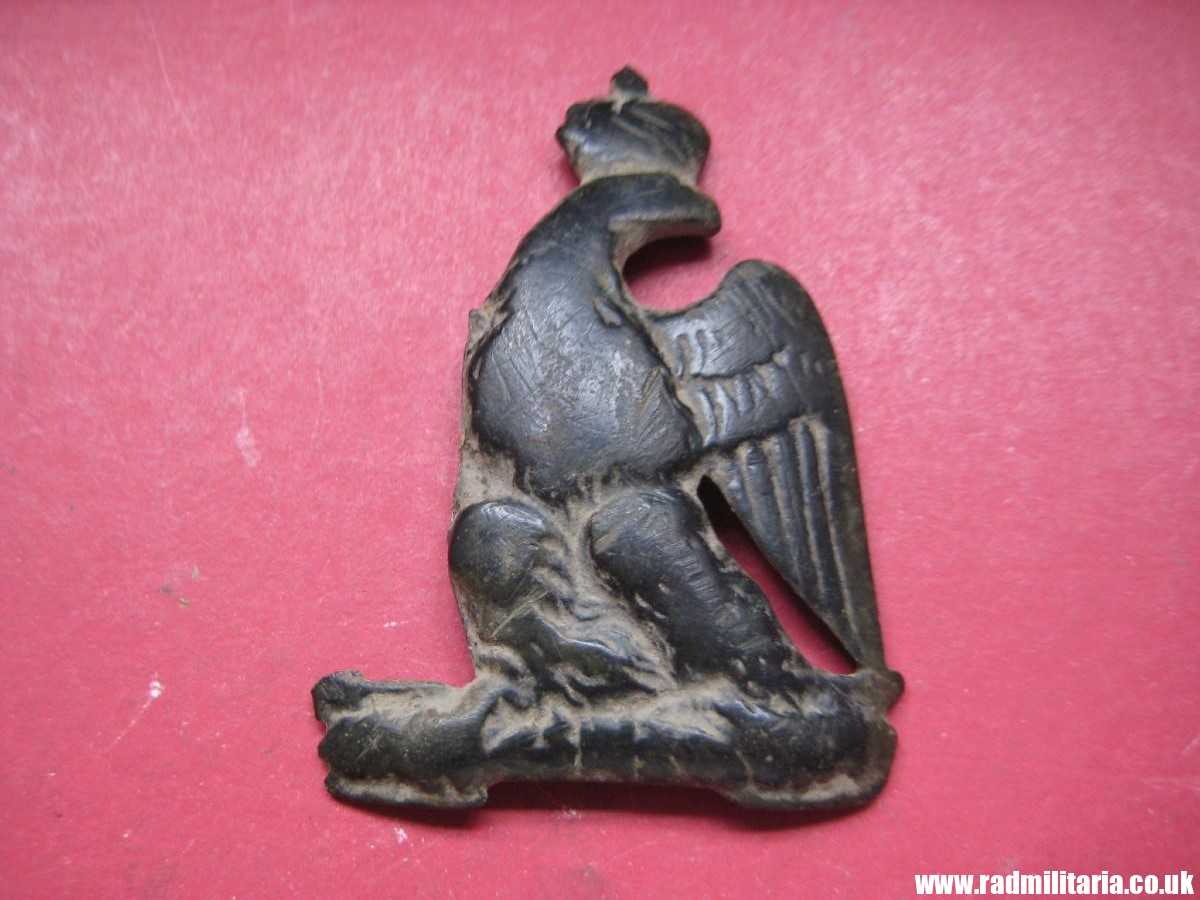 Today I am selling an original French metal EAGLE BADGE from Napoleonic Wars era. It is made of bronze. There are 2 metal pins on the reverse side to fix it to the cap or cartridge case. It is battlefield relic – metal detecting find. SIZE: 64.6mm x 44.4mm. Weight: 27.5g. I did not find any maker marks on the reverse side. It is in good used condition, but it is badly damaged – one of the eagle’s wing was broken and lost. The condition and all details you will find in the pictures. 100% genuine item from early 19TH Century.