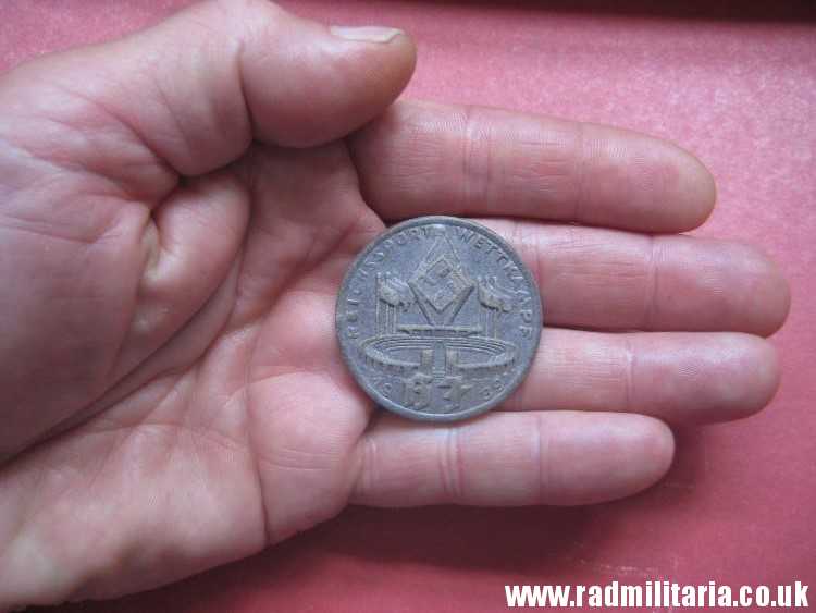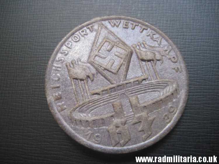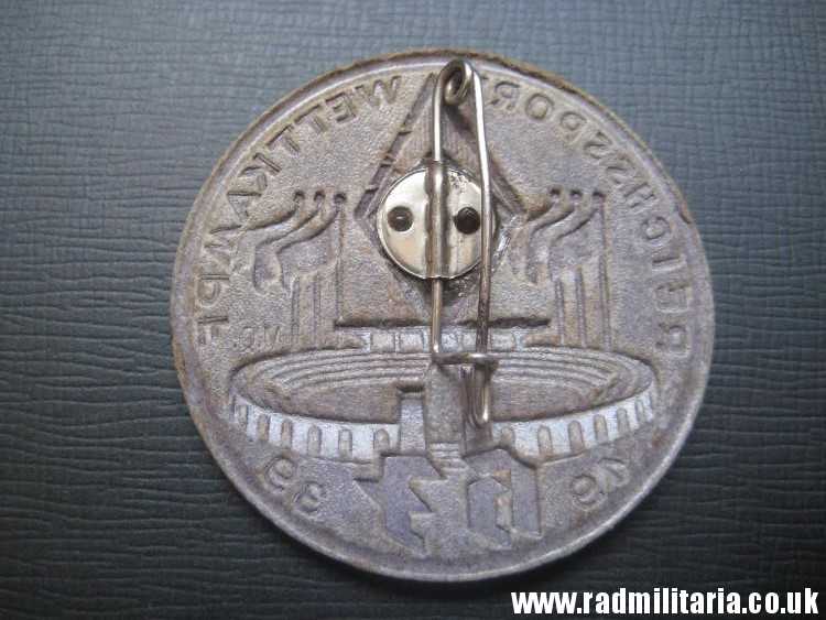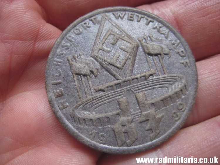 Today I am selling an original German HJ BADGE with swastika and date 1939. The badge is made of compressed paper. It is grey color painted. INSCRIPTION: “REICHSSPORT WETTKAMPF 1939 HJ”. This badge is in good used condition with original pin on the reverse side. No maker marks.  Size: diameter 38mm. The condition and all details you will find in the pictures. It original HJ badge from WW2 in good used condition.