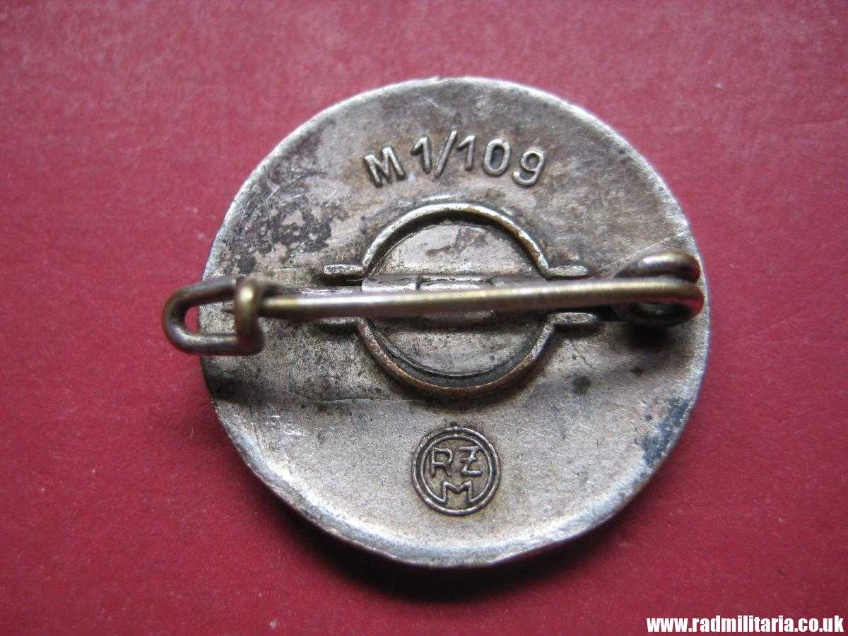 Today I am selling an original German NSDAP enamel membership badge. It is marked on the reverse side ‘RZM M1/109 – maker: M1/109 Glaser & Sohn, Dresden. There is original pin on the reverse side of this badge. It is original badge with red, white and black enamel on the front side. The enamel on this badge was broken and repaired – please look in the photos. The condition and all details you will find in the pictures.