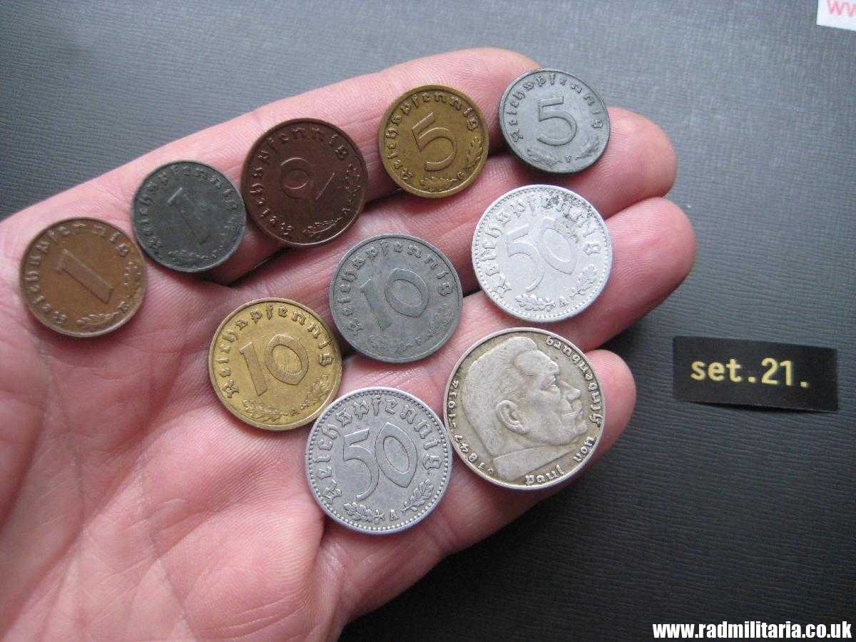*1 Pfenning 1937, *1Pfenning 1942, *2 Pfenning 1937, *5 Pfenning 1938, *5 Pfenning 1940 *10 Pfenning 1937, *10 Pfenning 1940, * 50 Pfennig 1935, *50 Pfenning 1940, *2 Mark 1937. Set no.21.