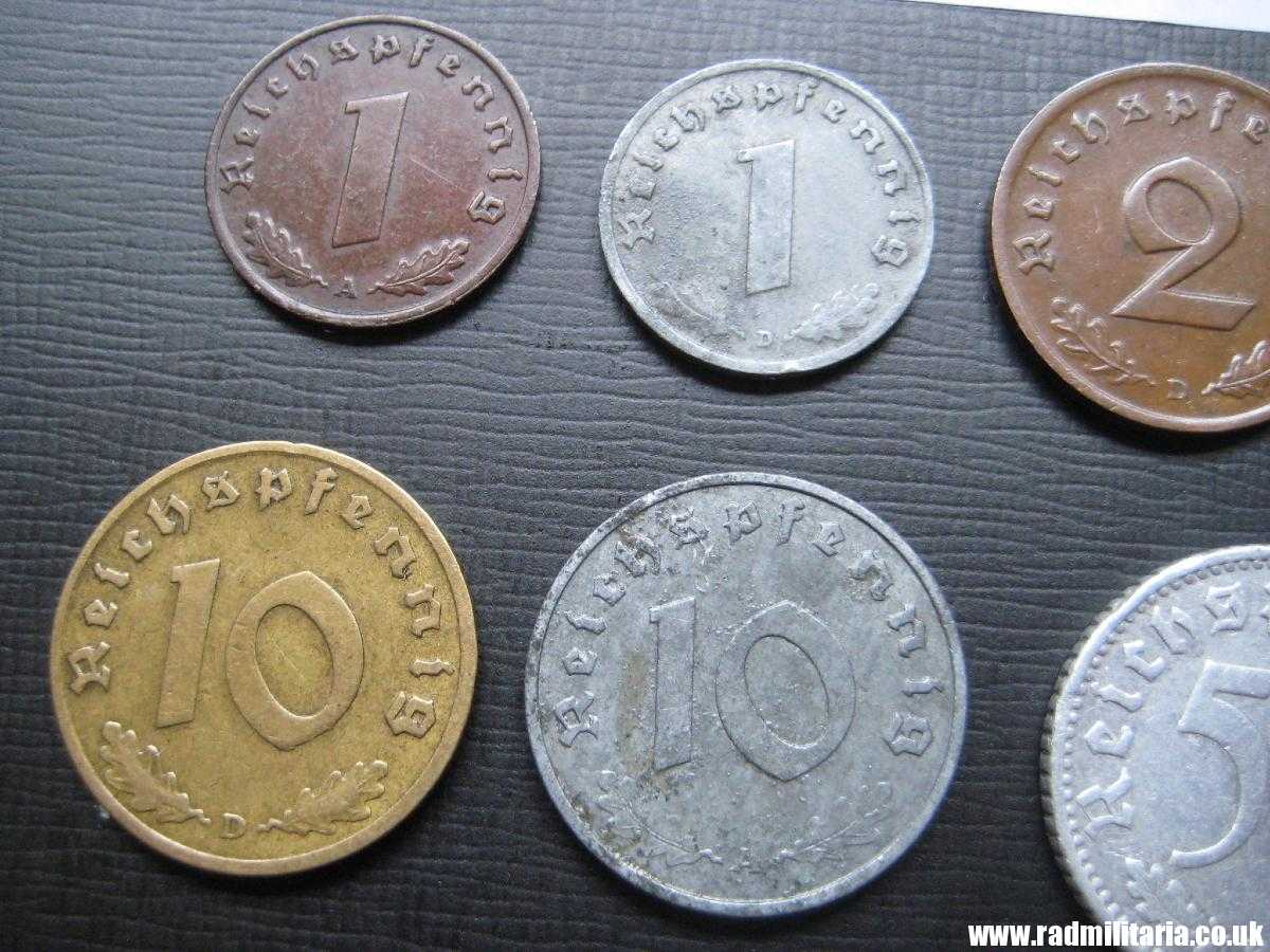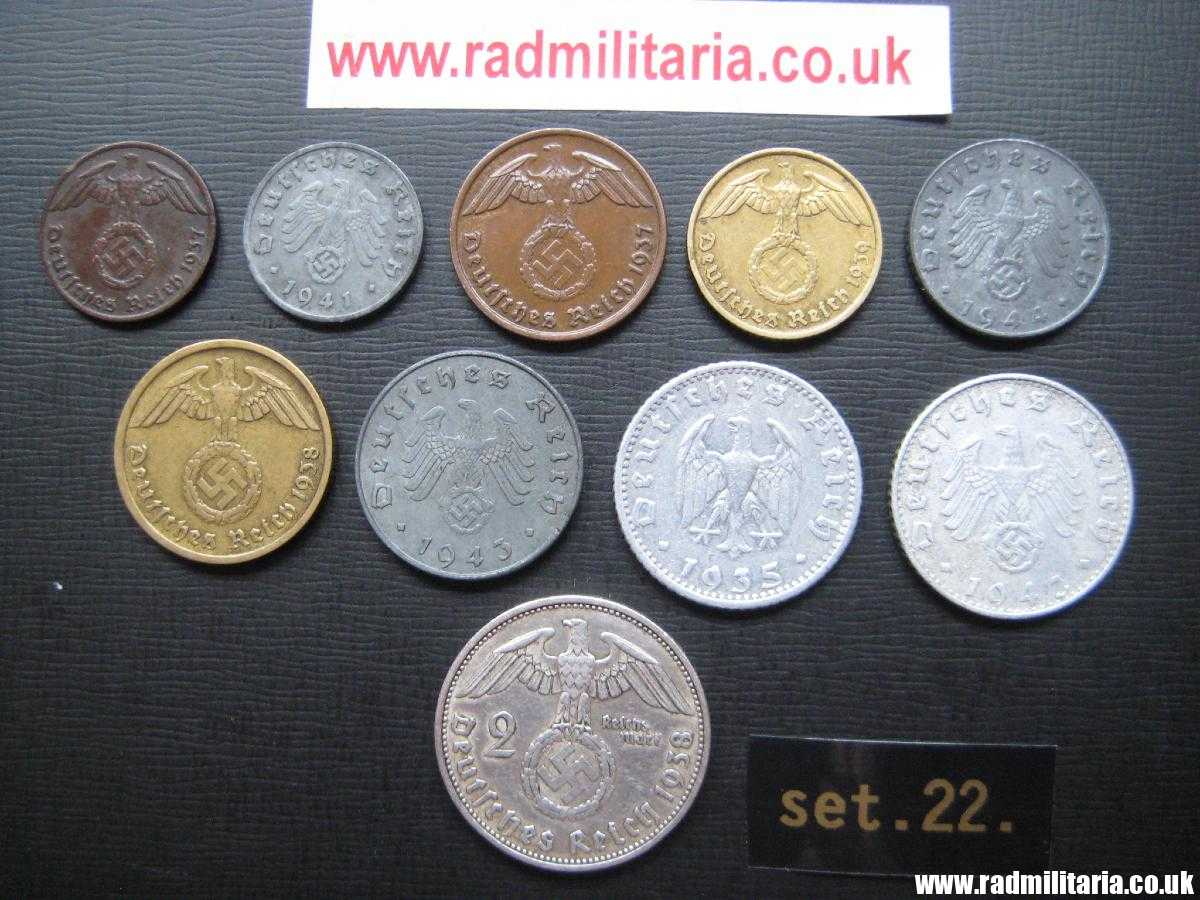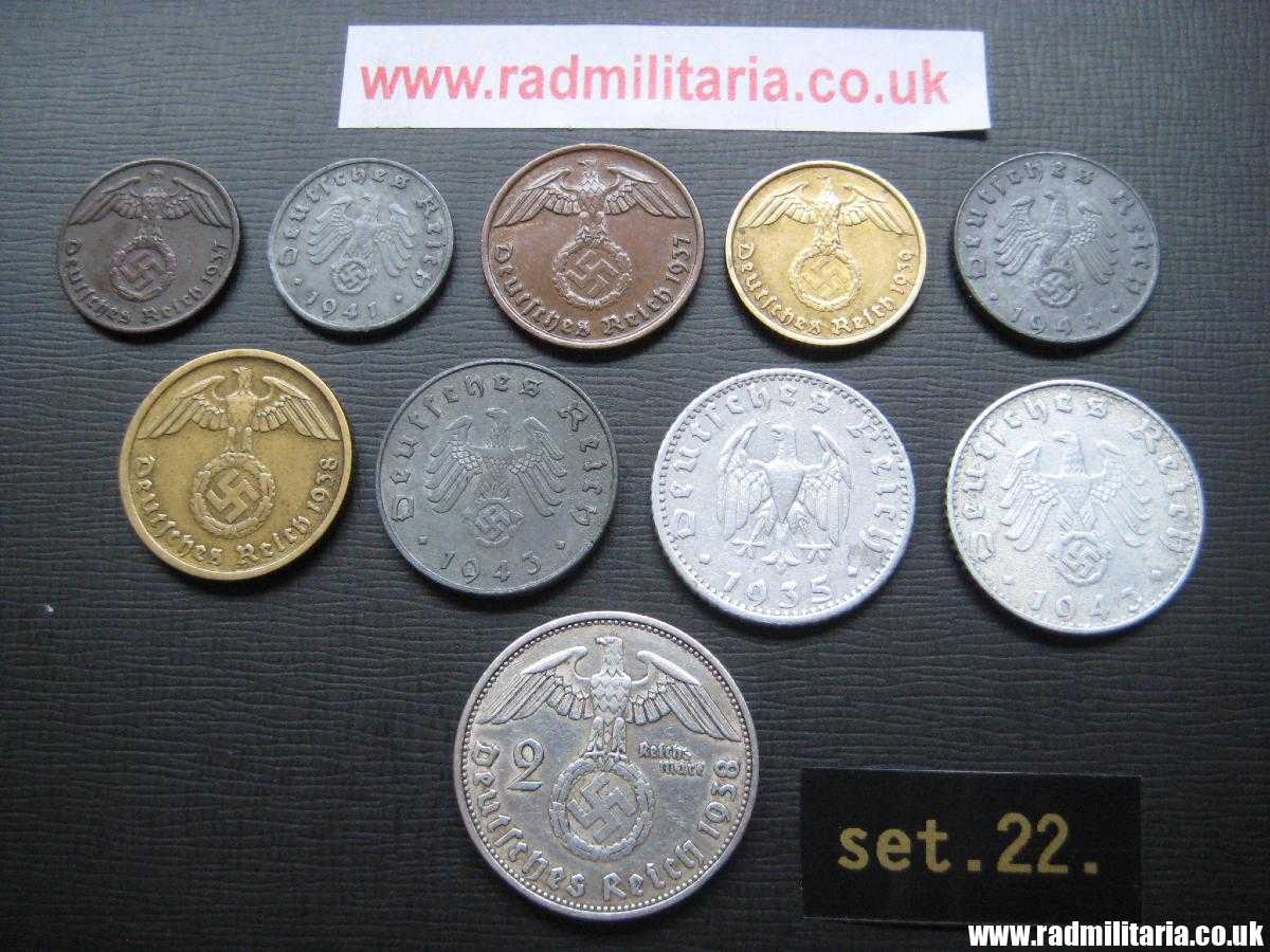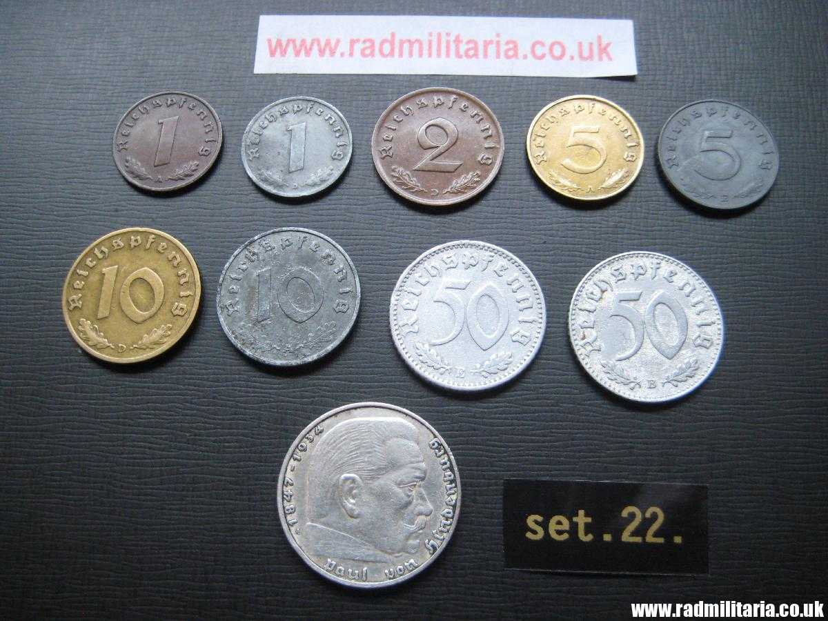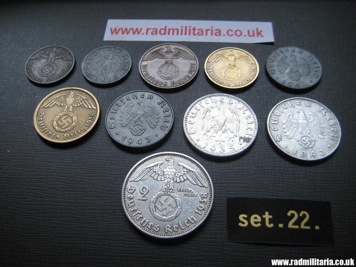 *1 Pfenning 1937, *1Pfenning 1941, *2 Pfenning 1937, *5 Pfenning 1939, *5 Pfenning 1944 *10 Pfenning 1938, *10 Pfenning 1943, * 50 Pfennig 1935, *50 Pfenning 1943, *2 Mark 1938. Set no.22.