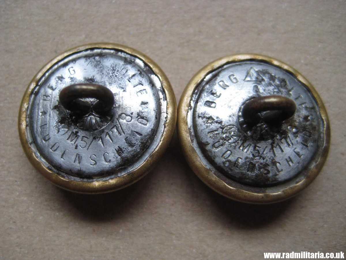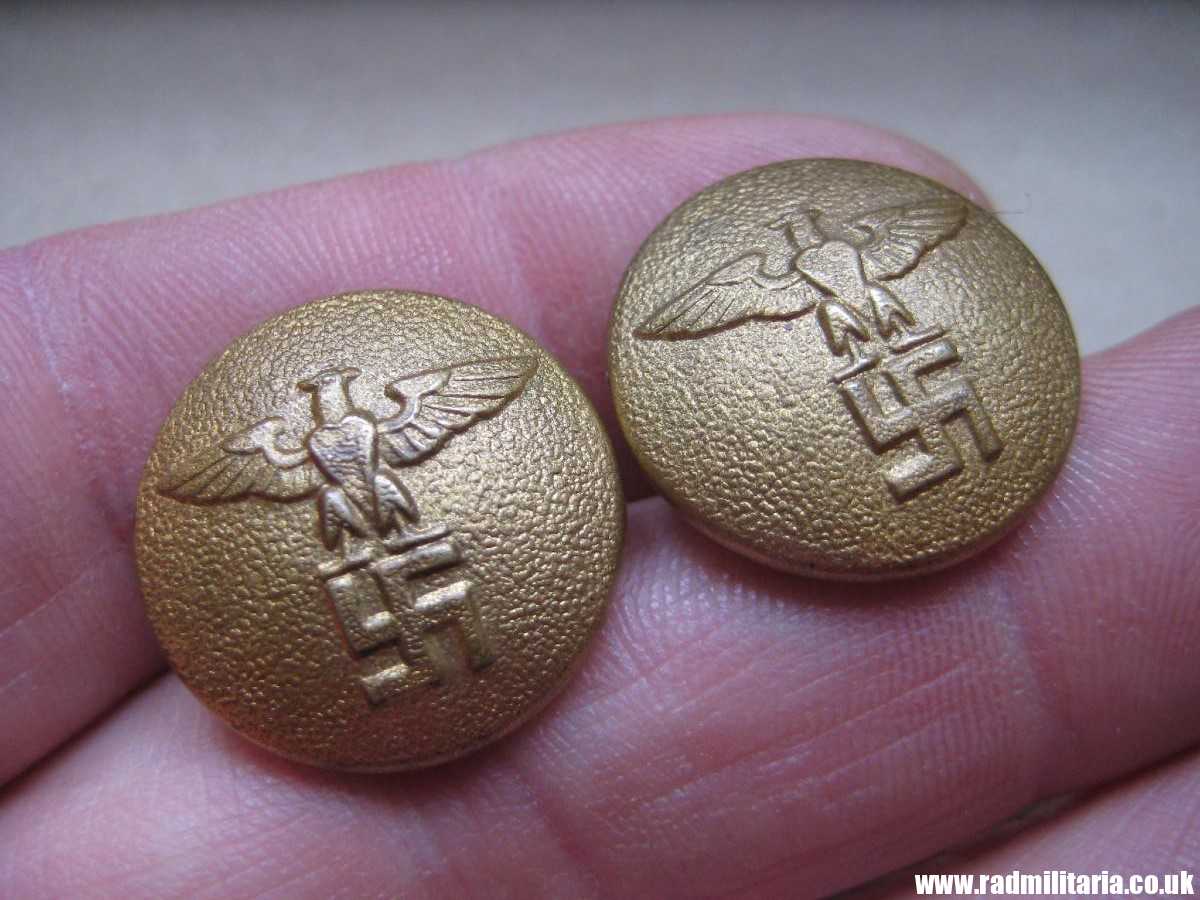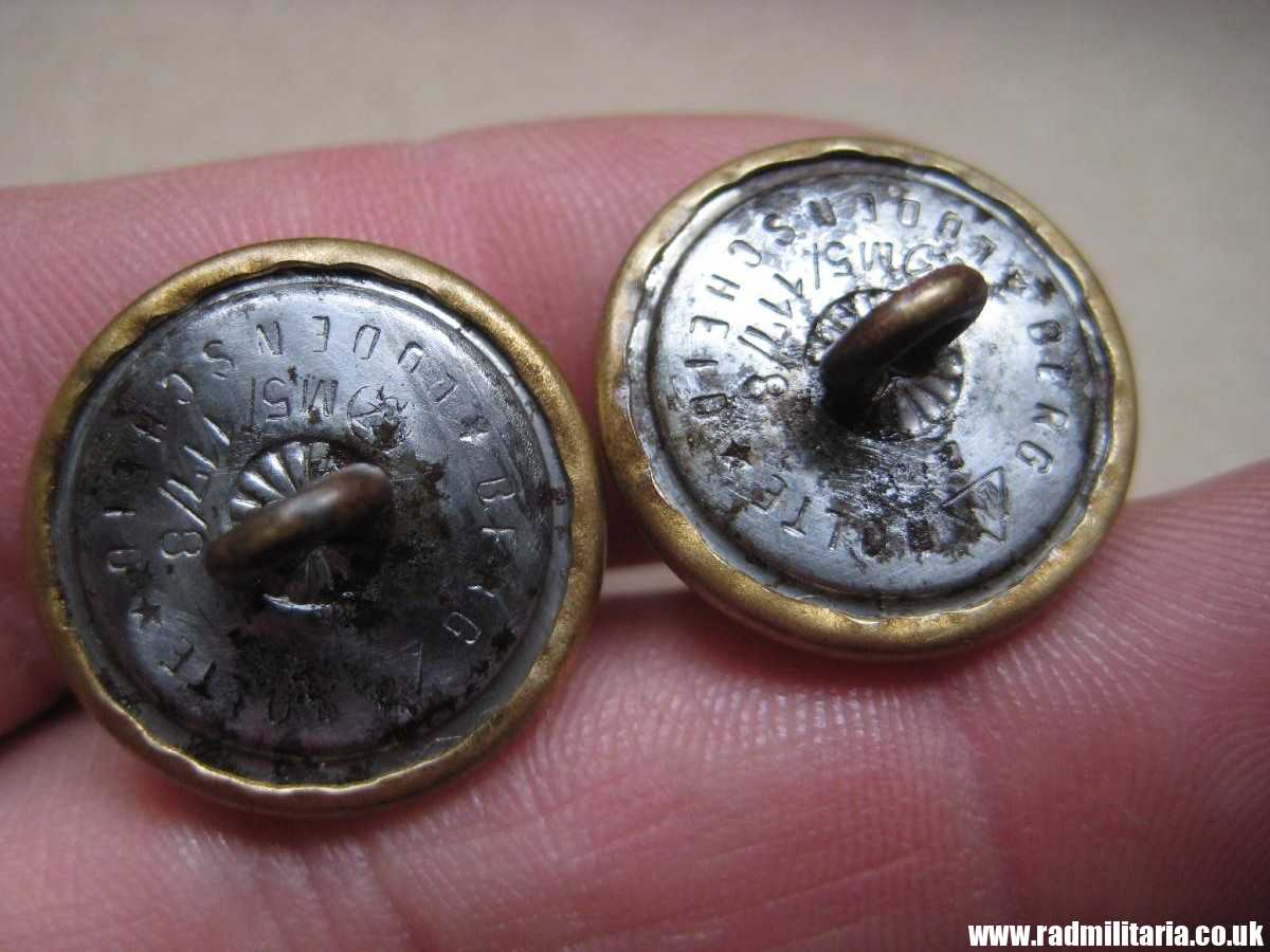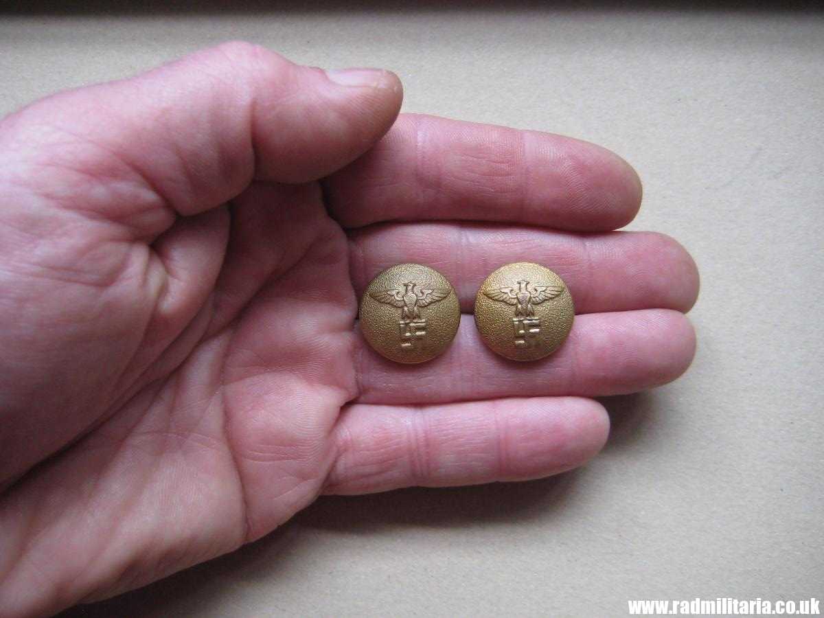 Today I am selling ORIGINAL NSDAP BUTTONS – set of 2. These were worn on NSDAP uniform. Both buttons are made of steel (magnetic) and gold plated or painted to the front side. There are rare maker marks: “RZM M5/117/8 BERG NOLTE LUDENSCHEID” on the reverse side. Size: diameter 20.3mm. Weight: 3.5g/each. The condition and all details you will find in the pictures. Nice set of 2 – 100% genuine NSDAP buttons in good used condition.