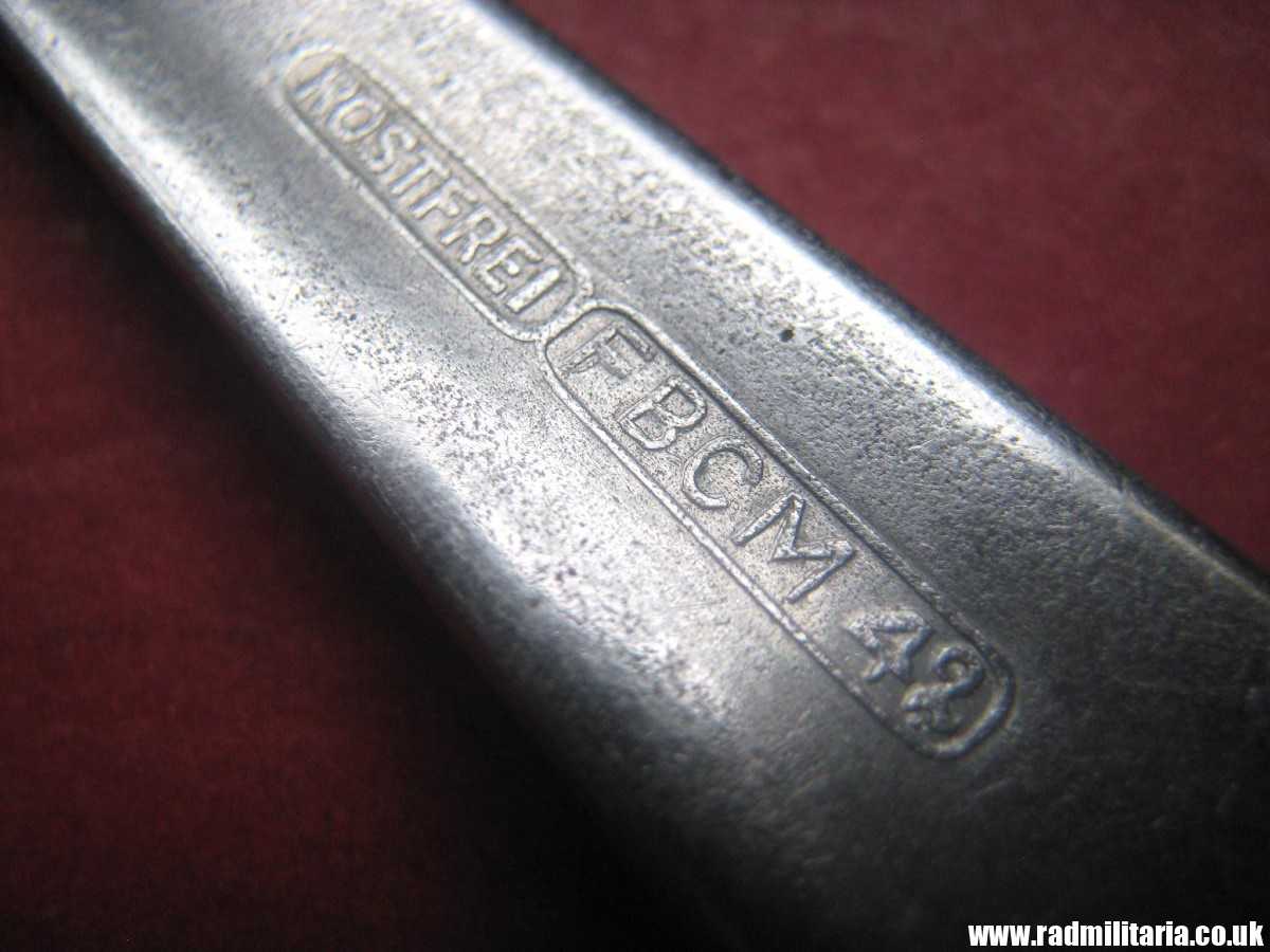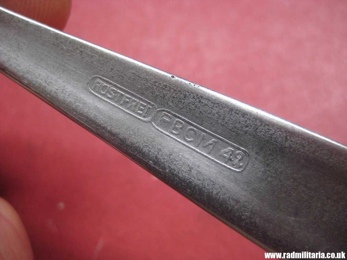 I am selling 100% original WW2 German Wehrmacht FORK made of stainless steel. It is in good used condition. Size: lenght 21cm. Weight – 35g. The condition and all details you will find in the pictures. There is maker mark: “ROSTFREI FBCM 42” . Probably it was produced in 1942. It is original Wehrmacht FORK from WW2 era in good used condition. 100% genuine !