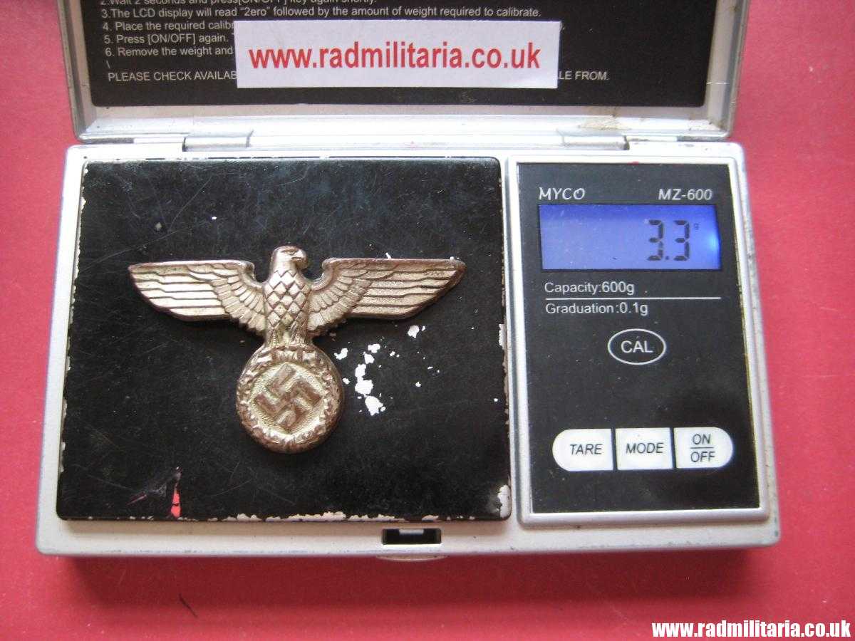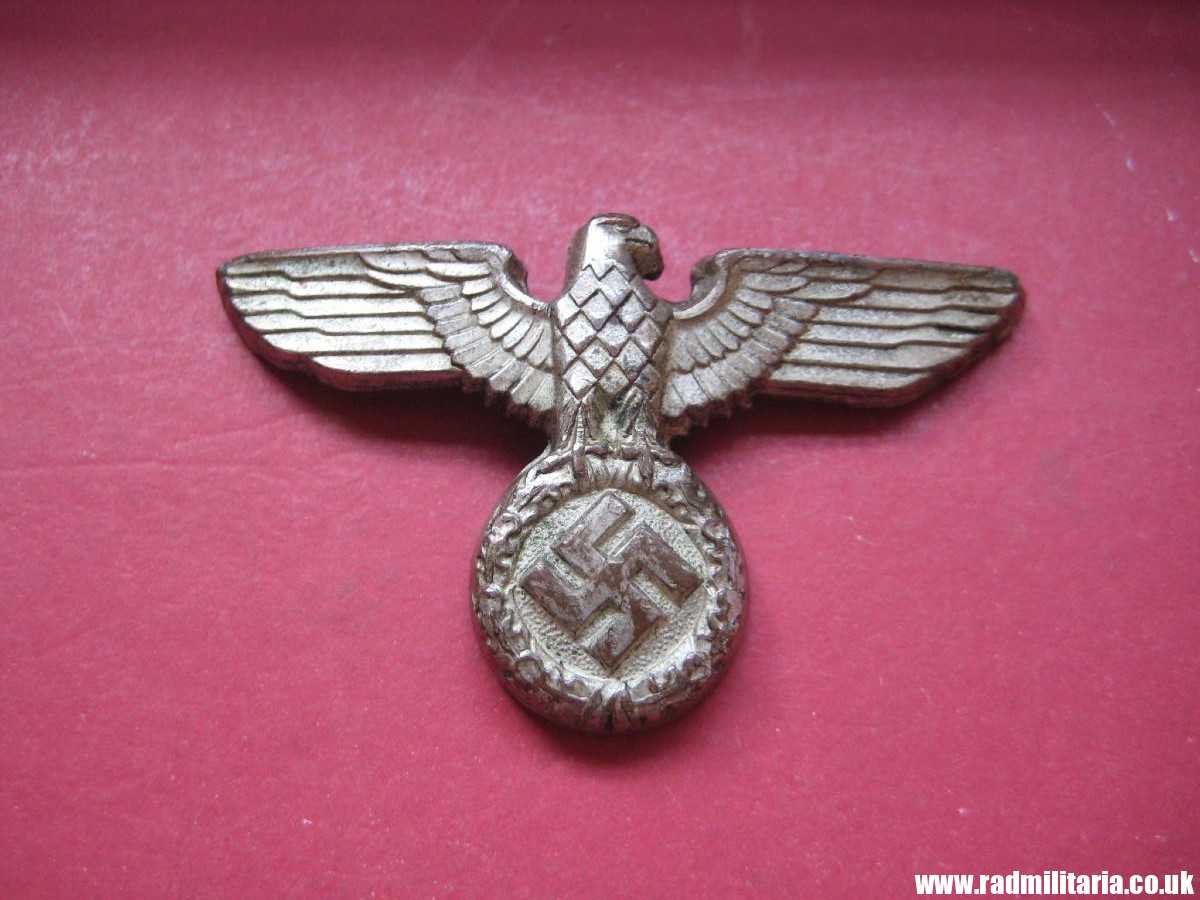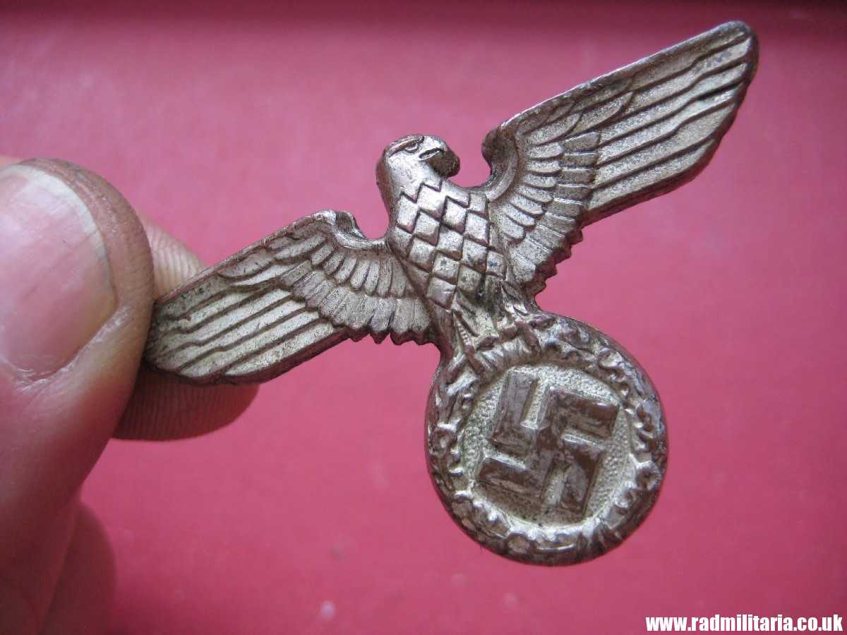 Today I am selling 100% original German NSDAP or SA EAGLE CAP BADGE from WW2 era. The badge is made of CUPAL silver plated aluminum and copper (front). It is in good used condition. There is one original pin on the reverse side, 2 were broken and lost. There are maker marks on it: “RZM M1/13” – maker: M1/13 L. Christian Lauer, Nürnberg. Size: 58.3mm x 34.4mm. Weight: 3.3g. The condition and all details you will find in the pictures. It is original item from WW2 era.