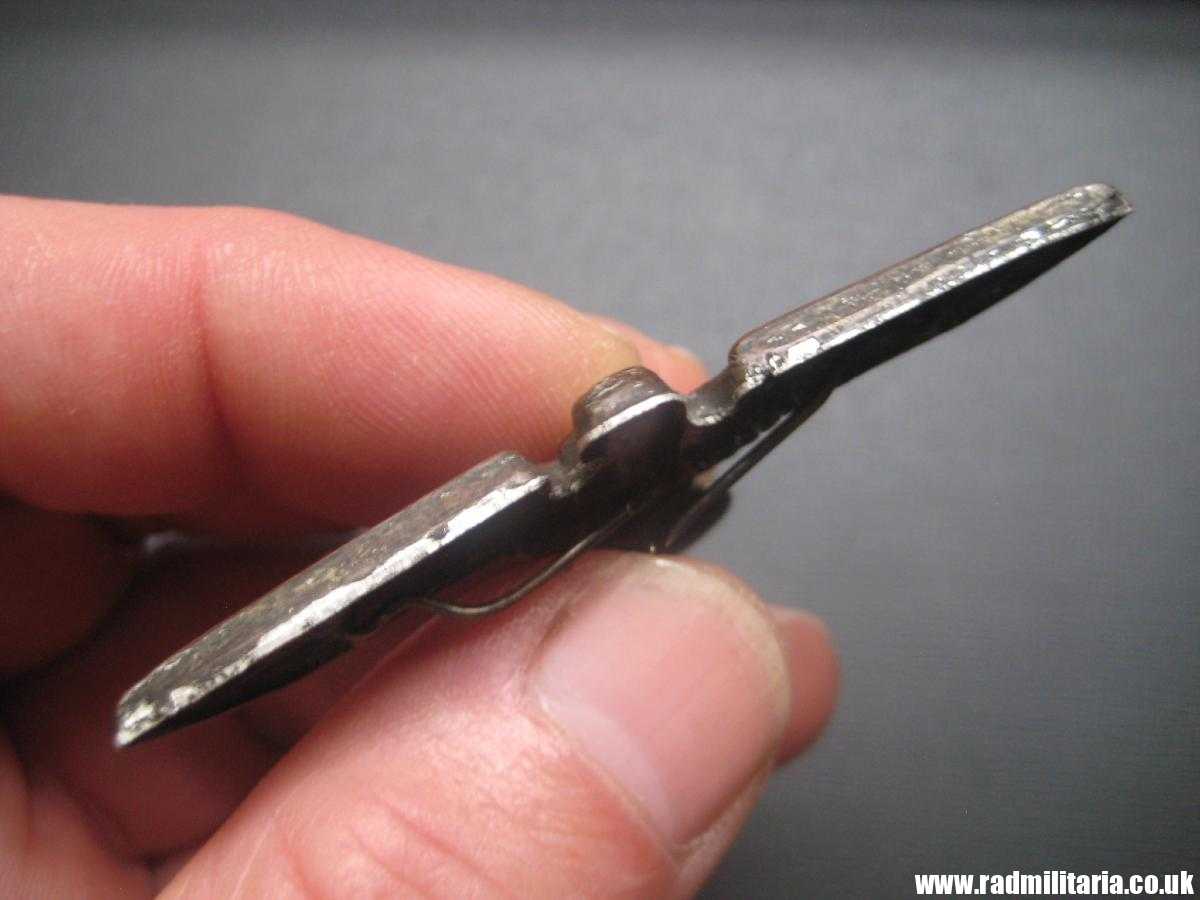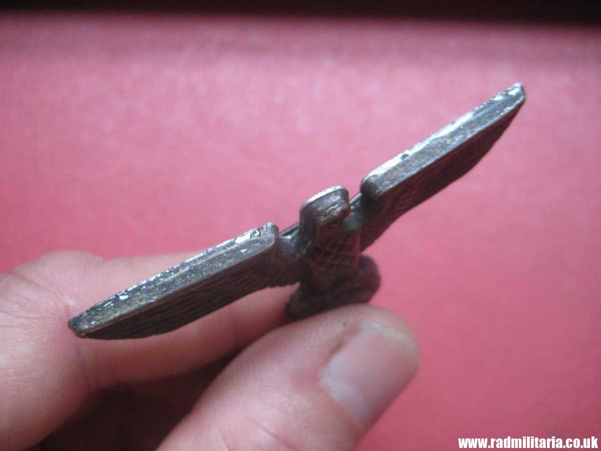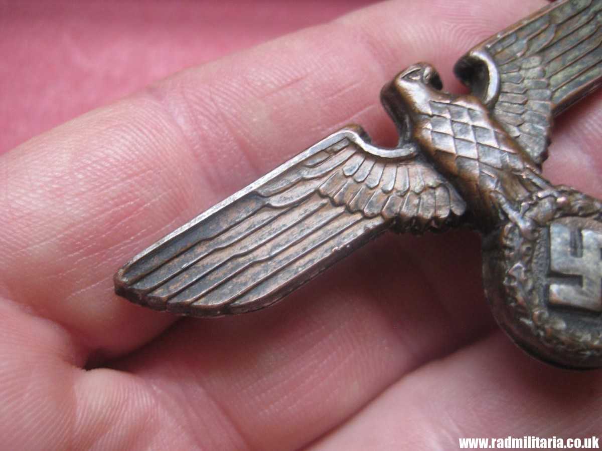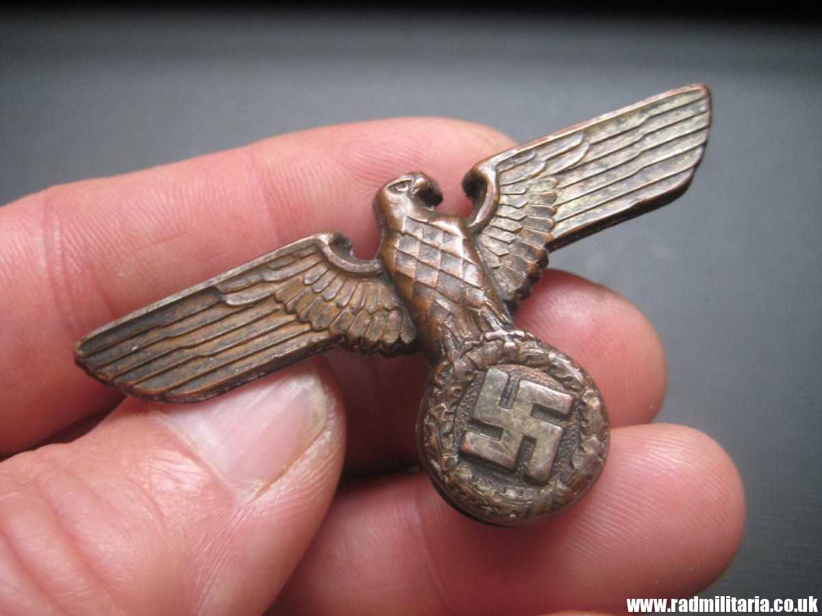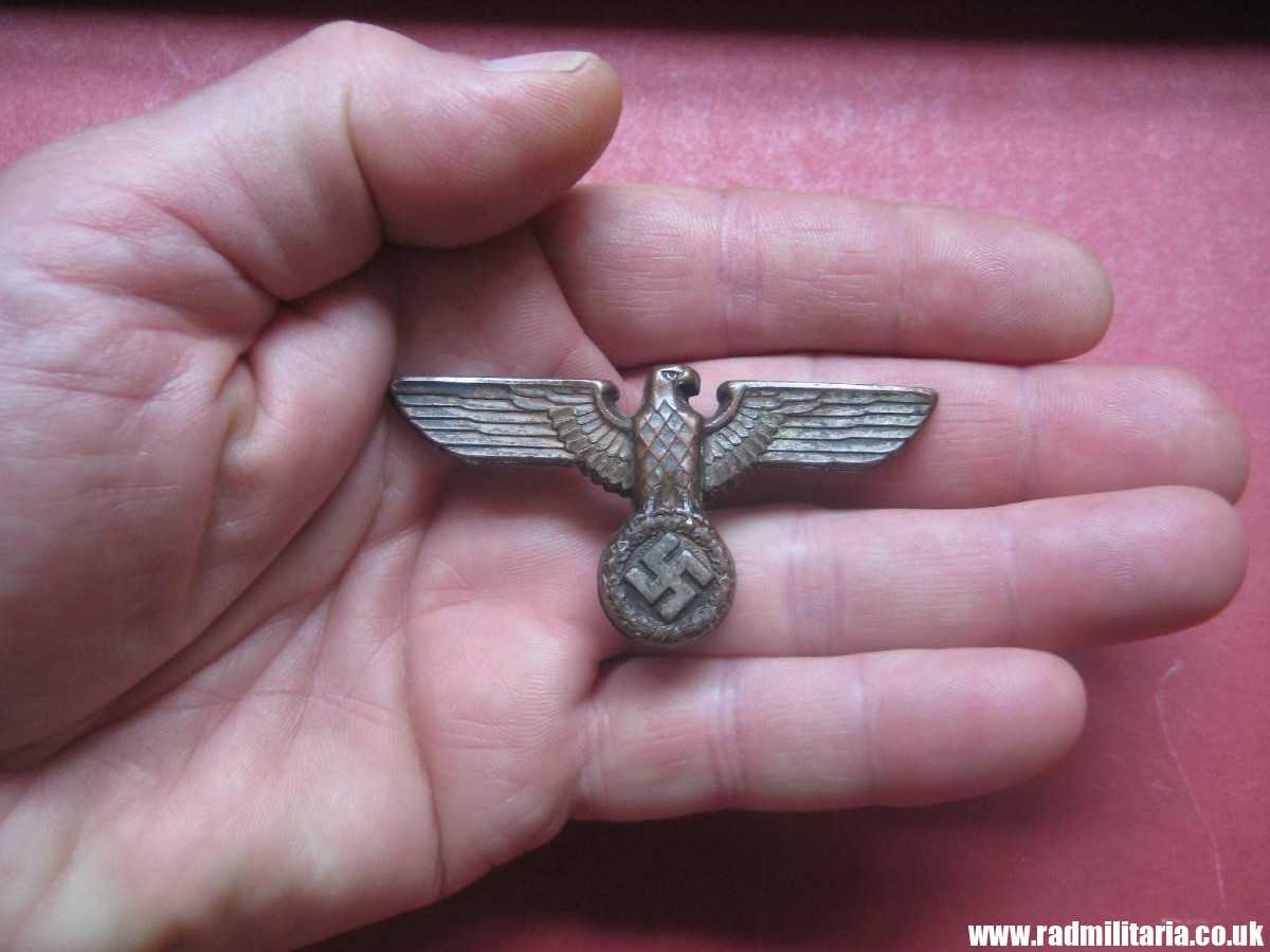 Today I am selling 100% original German NSDAP EAGLE CAP BADGE from WW2 era. The badge is made of CUPAL aluminum and copper (front). It is in good used condition complete with all original pins on the reverse side. There are maker marks on it: “RZM M1/21” – maker: M1/21 Paul Meybauer, Berlin-Waidmannslust. Size: 66mm x 33.4mm. Weight: 3.4g. The condition and all details you will find in the pictures. It is original item from WW2 era.