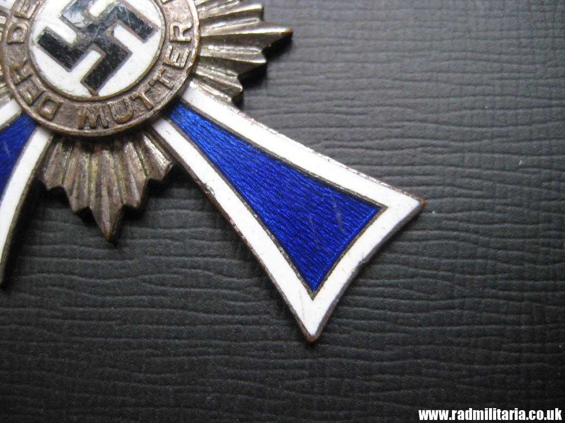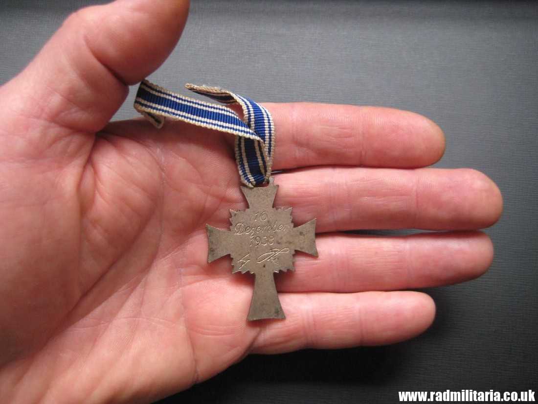 Today I am selling an original WW2 German CROSS in good used condition. It is Cross of Honor of the German Mather 2nd Class in Silver – Ehrenkreuz der Deutschen Mutter. There is description: “16. December 1938” and signature on the reverse side. It is made of brass and silver plated. It comes with short ribbon. The enamel is OK – not damaged. It is 100% original enamel cross. The condition and all details you will find in the pictures. It is original item from WW2 era in good used condition.