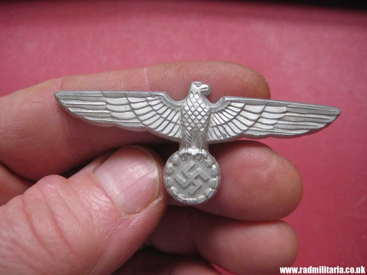 Today I am selling 100% original German EAGLE CAP BADGE from WW2 era in used condition. The badge is made of aluminum (Wehrmacht). It is in good condition but all original pins on the reverse side are broken and lost. There are maker marks: “AG&S 39” on the reverse side. Size: 64.5mm x 26.6mm. Weight: 2.3g. The condition and all details you will find in the pictures. It is original item from WW2 era.
