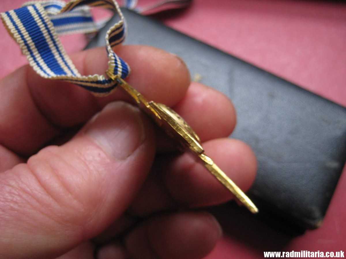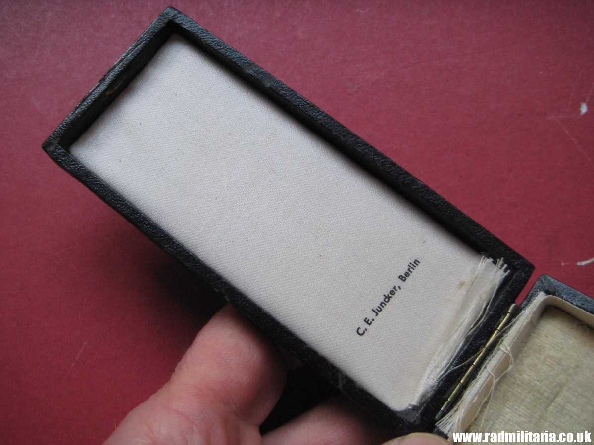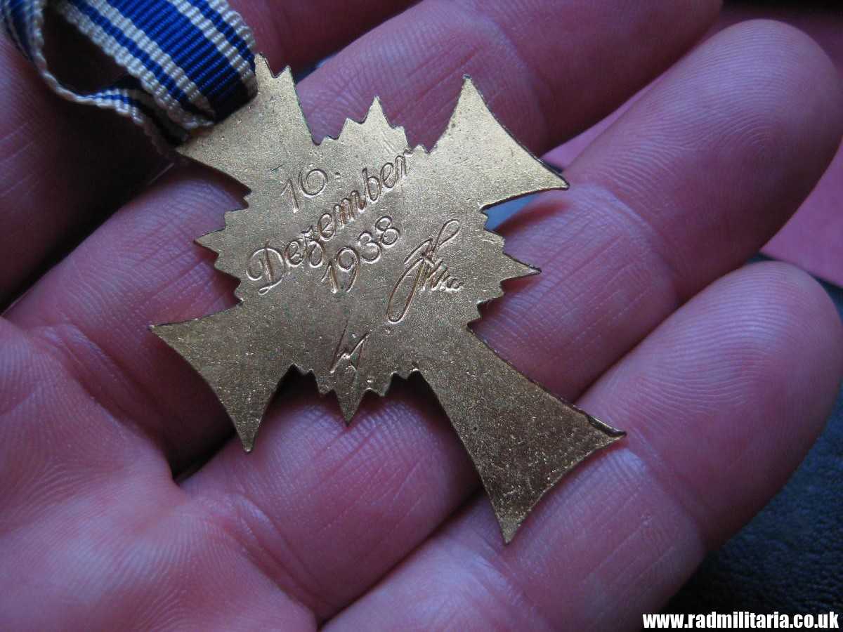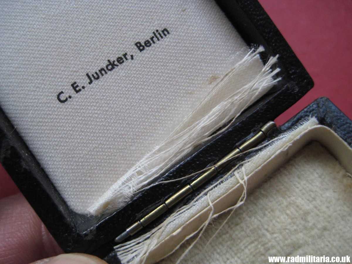 Today I am selling an original WW2 German CROSS in good used condition. It is Cross of Honor of the German Mother 2nd Class in Gold – Ehrenkreuz der Deutschen Mutter. It comes with original Box of issue and long ribbon. There is maker mark inside the box on the lid: “C.E. Juncker, Berlin”. Inscription on the Cross: “16. December 1938” and signature. This enamel cross is made of brass and gilded or gold painted. Size of the cross: 35.1mm x 45.4mm. Size of the box: 11.3cm x 5cm x 2.1cm. It comes with original long ribbon. There is white, black and blue enamel on the cross. Enamel is not perfect – please look in the photos. The condition and all details you will find in the pictures. GENUINE German ENAMEL CROSS – Gold Class from WW2 era.