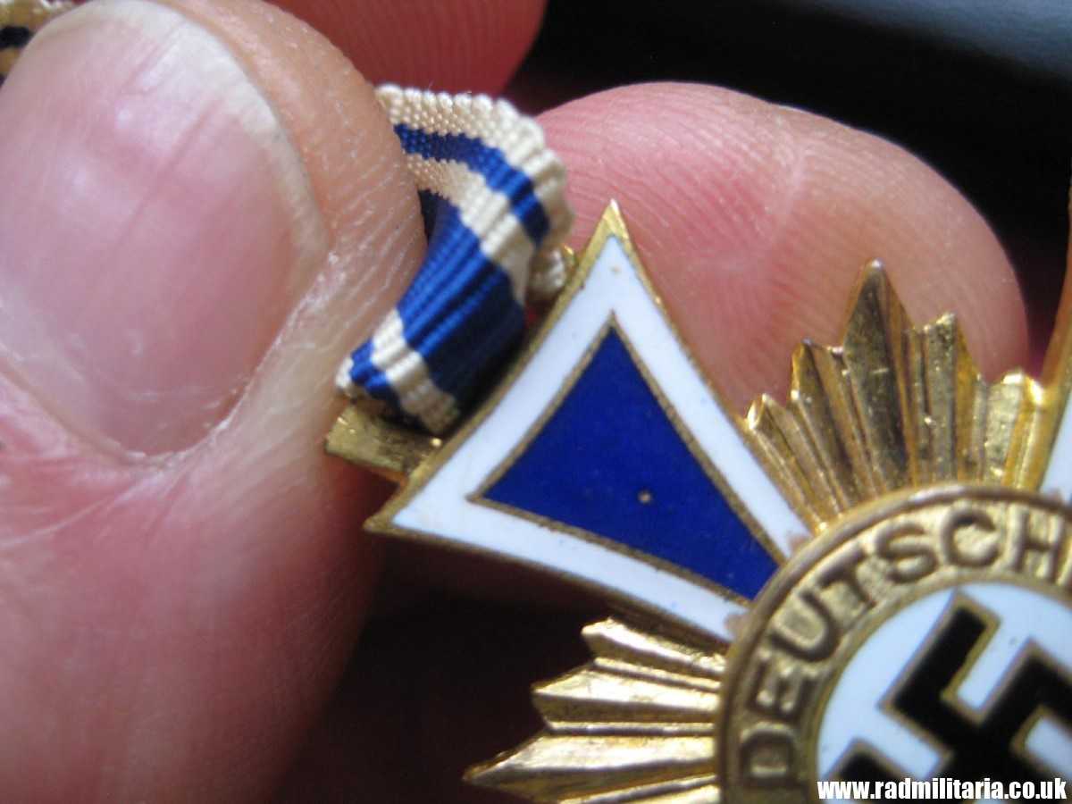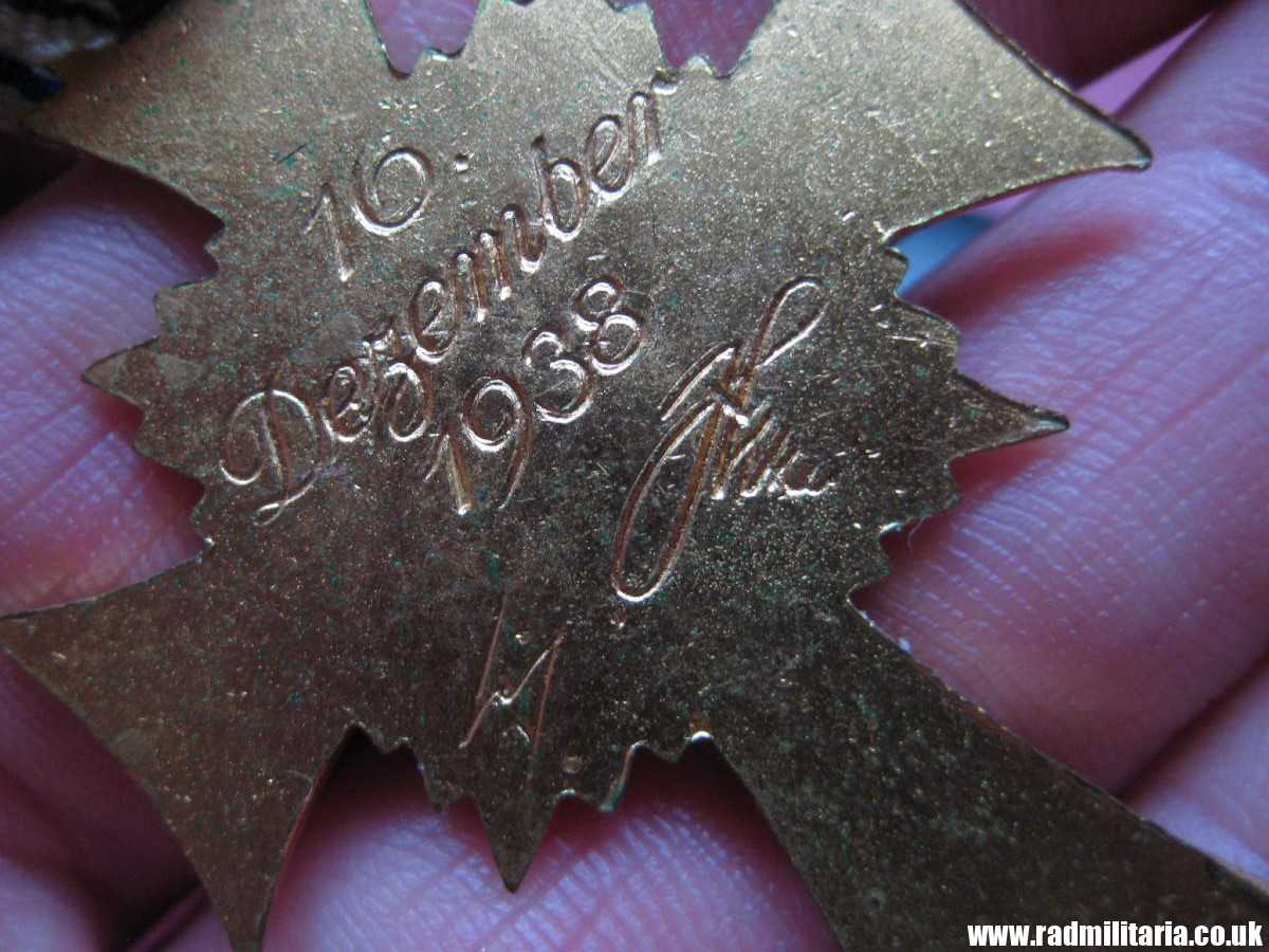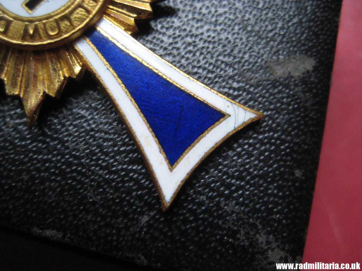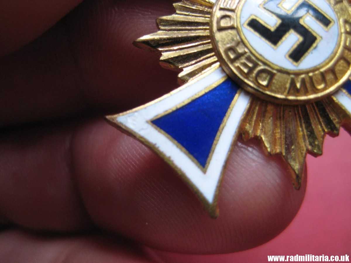 Today I am selling an original WW2 German CROSS in good used condition. It is Cross of Honor of the German Mother 2nd Class in Gold – Ehrenkreuz der Deutschen Mutter. It comes with original Box of issue and long ribbon. There is maker mark inside the box on the lid: “C.E. Juncker, Berlin”. Inscription on the Cross: “16. December 1938” and signature. This enamel cross is made of brass and gilded or gold painted. Size of the cross: 35.1mm x 45.4mm. Size of the box: 11.3cm x 5cm x 2.1cm. It comes with original long ribbon. There is white, black and blue enamel on the cross. Enamel is not perfect – please look in the photos. The condition and all details you will find in the pictures. GENUINE German ENAMEL CROSS – Gold Class from WW2 era.