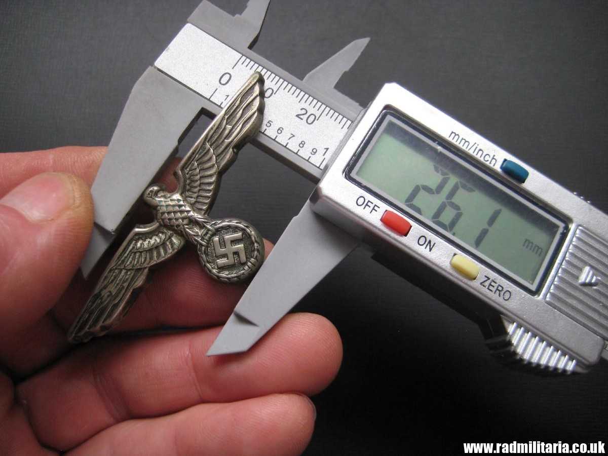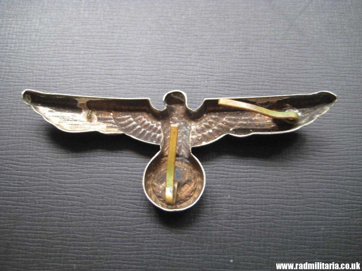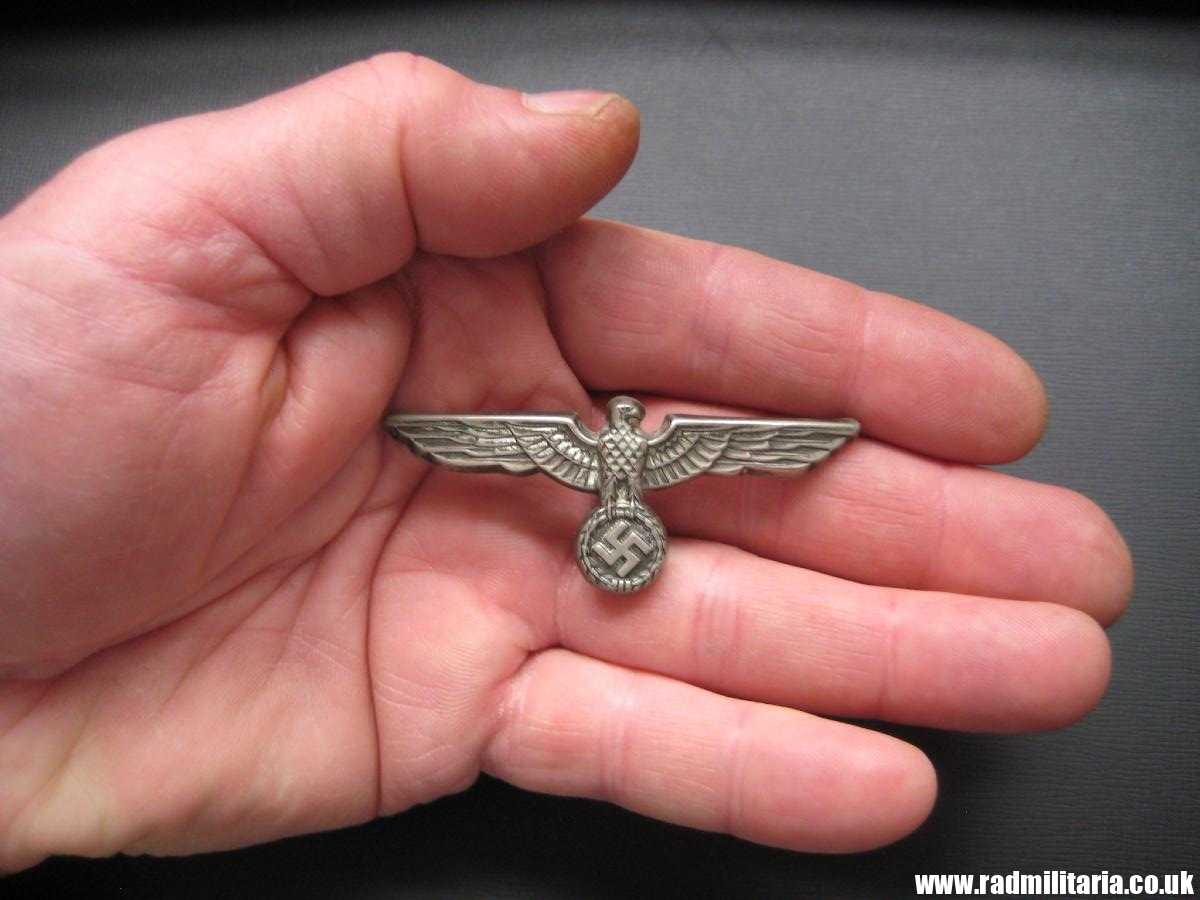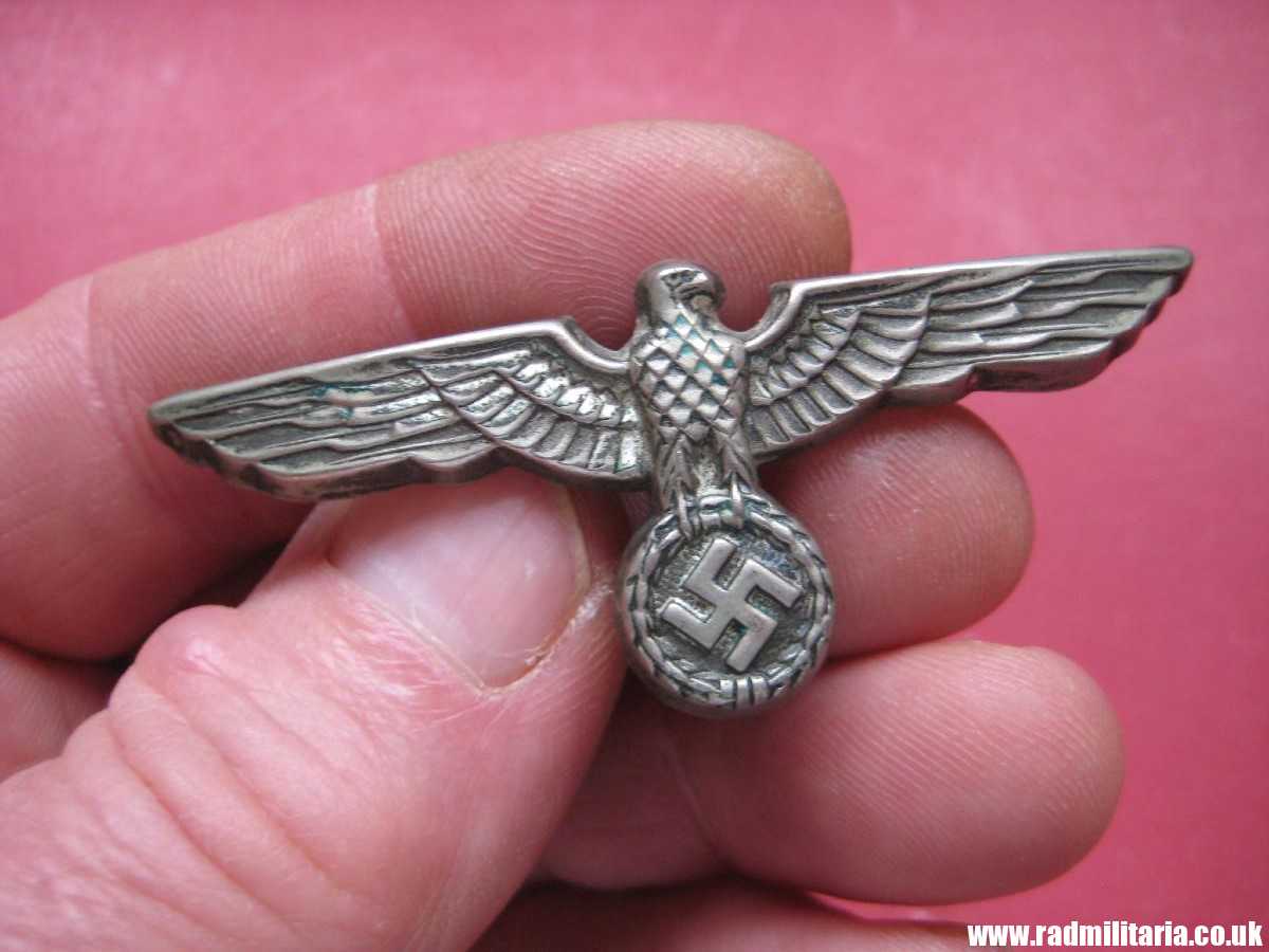 Today I am selling original German Wehrmacht EAGLE CAP BADGE from WW2 era. High quality. The badge is made of silver plated brass/white metal (non magnetic). It is in very good used condition with 2 original pins on the reverse side one pin is broken and lost. I did not find any maker marks. Size: 64.6mm x 26mm. Weight: 4.2g. The condition and all details you will find in the pictures. It is original item from WW2 era – early production.