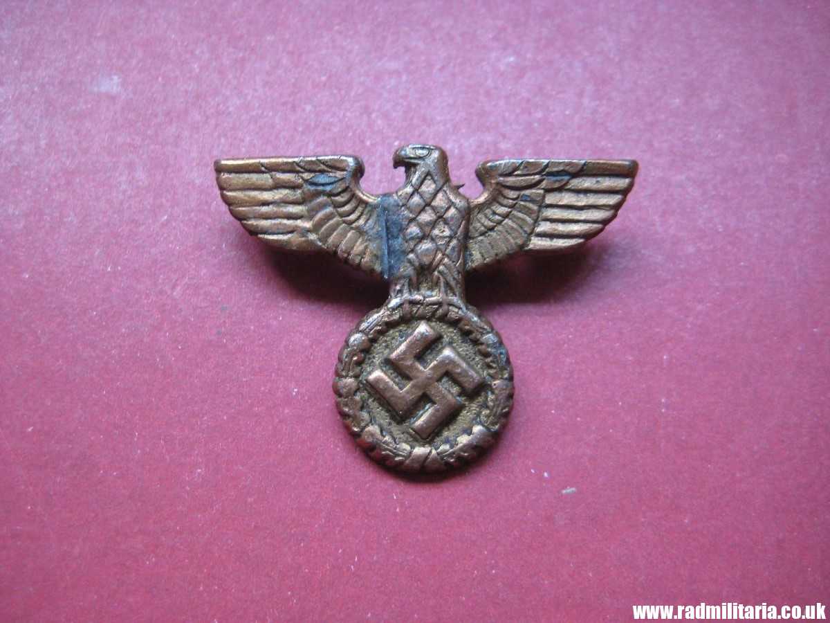 Today I am selling 100% original German EAGLE CAP BADGE from WW2 era. The badge is made of brass or bronze. Good used condition but one wing was broken and repaired by the glue – please look in the photos. There are 2 pins on the reverse side. I did not find any maker marks. Size: 28mm x 37.3mm. Weight: 3g. I think it was used by NSDAP or Reichsbahn members. The condition and all details you will find in the pictures. It is original item from WW2 era.